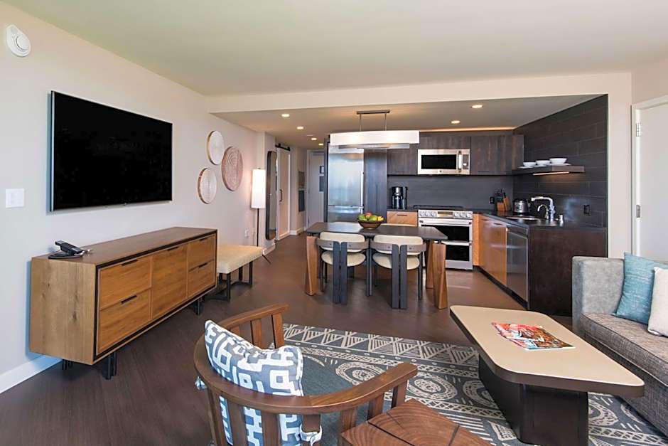 This upper-floor, two-bedroom suite has a living area with hard floors and sofa bed, a 65" flat-screen 65" and PlayStation3. There is a fully equipped kitchen and a separate dining area. The master bedroom offers a king bed and a 55" TV. Also comes with 2 bathrooms, a washer, tumble dryer and a balcony.